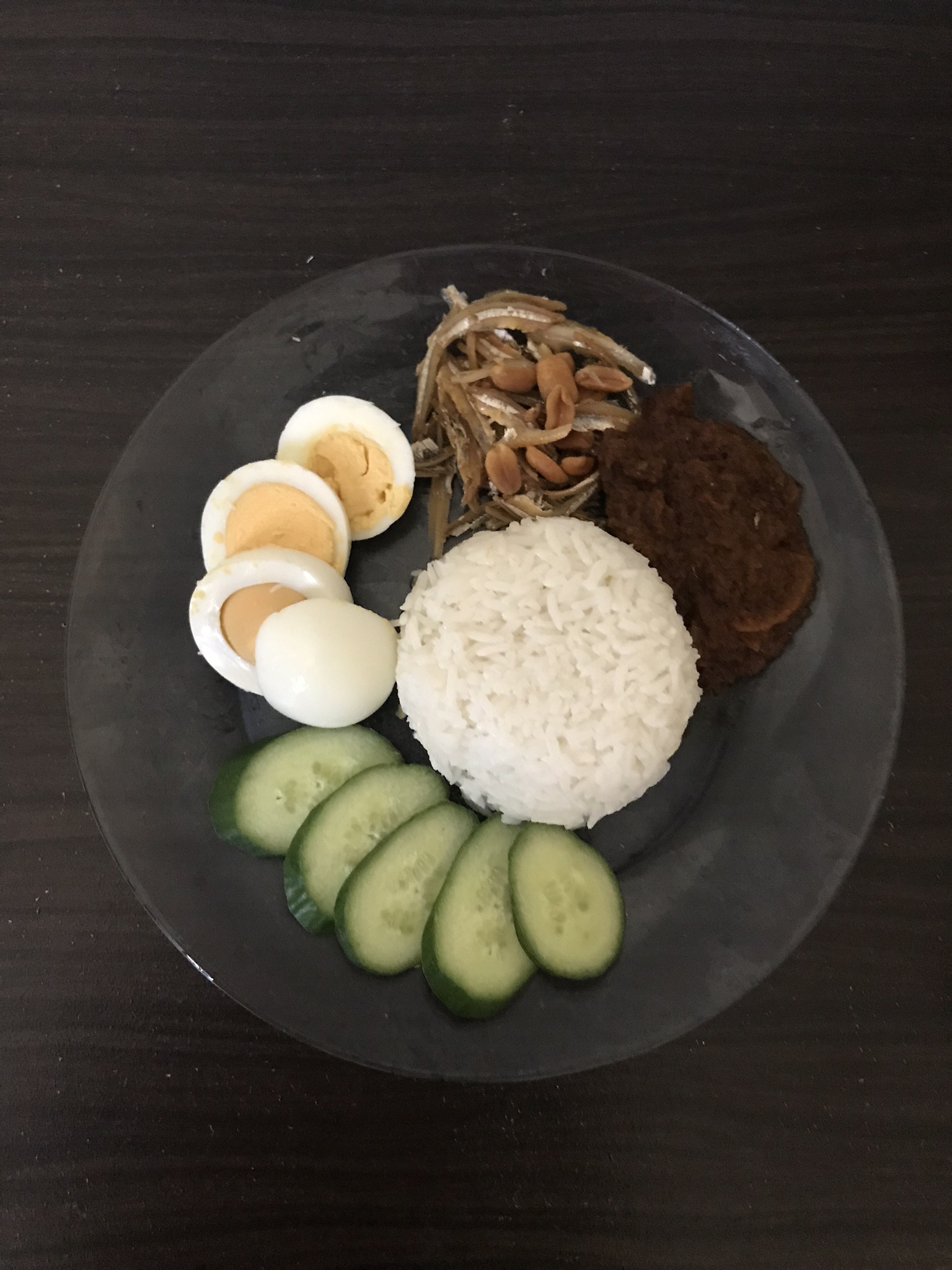 A quintessential Malaysian favorite. Nasi Lemak features fragrant and rich coconut rice with spicy sambal, topped with crispy anchovies, crunchy peanuts, hard-boiled egg, and cool cucumber.