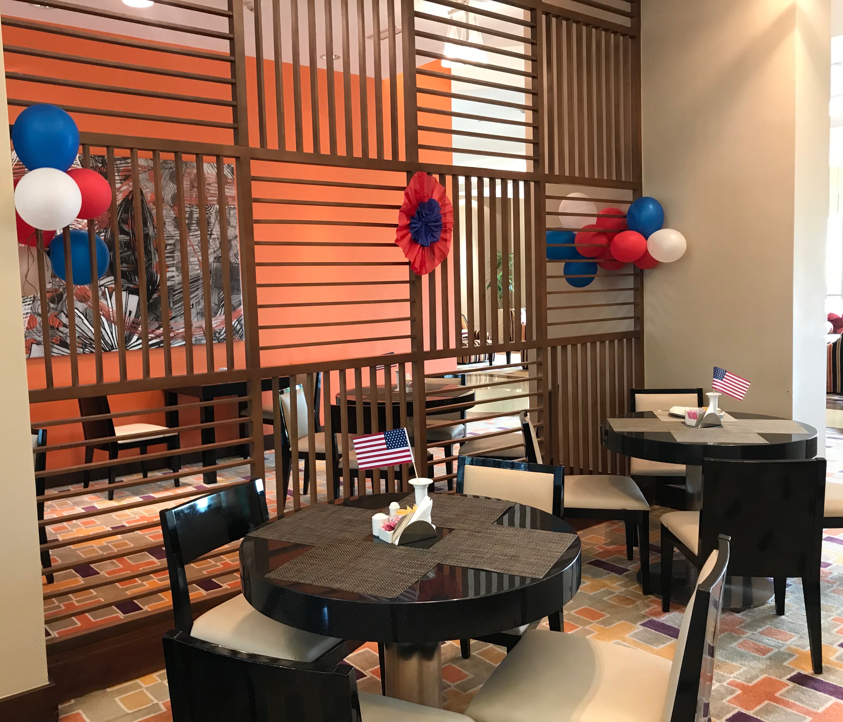 There is a small American flag as the centerpiece on each table, red, white and blue balloons beautifully displayed around the dining area, and even large glass vases filled with water and dyed for our patriotic pleasure.